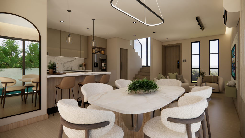Los materiales juegan un papel fundamental ya que adaptan el concepto básico del diseño integrando la naturaleza, guardando armonía con los gustos de sus habitadores. La madera, el vidrio, el hormigón, el acero, mármol, cuarzo, melamina, hay cantidades de materiales y texturas en presentaciones de diferentes formatos y colores que se busca armonizar los espacios con lineas invisibles que delimitan espacios y a la vez los integran. Fusionando estos, podemos lograr experiencias sensoriales únicas si nuestra intención es deslumbrar y a la vez armonizar con transito, uso y estadías funcionales.